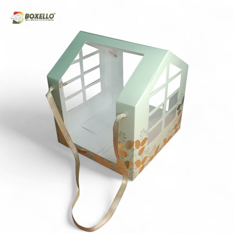 Hut Shape Hamper Boxes With Gold Foiling in SBS Paper ITC To Make Them Sturdy And Beautiful Golden Rope